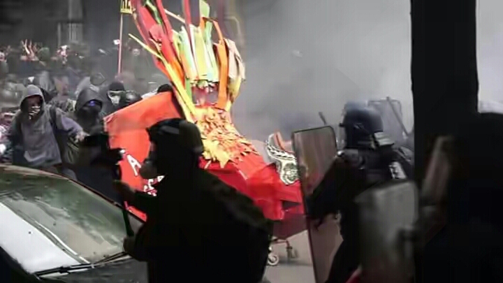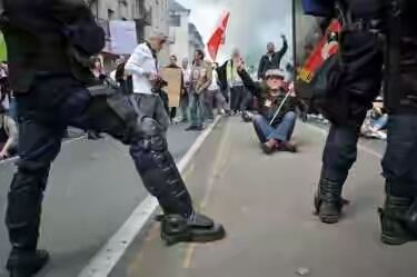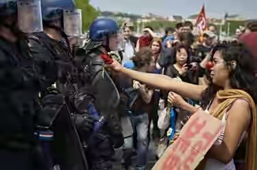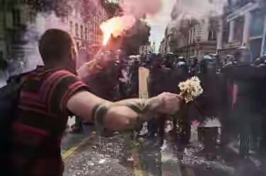 APF A protester confronted police with a torch and a bouquet of flowers in Lyon