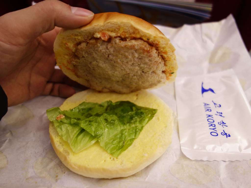 In-flight entertainment is usually limited to the popular Moranbong Band girl group singing patriotic odes to the leader. Or North Korean cartoons, shown on drop-down screens attached to the cabin ceilings. On the less than two-hour hop from Beijing, there is a meal of sorts. It resembles a hamburger.