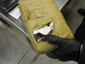 After an “intensified investigation,” officers discovered seven brick-shaped packages attached to the bottom of the carts, which were wrapped in plastic and contained a white powder.