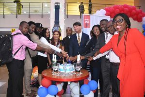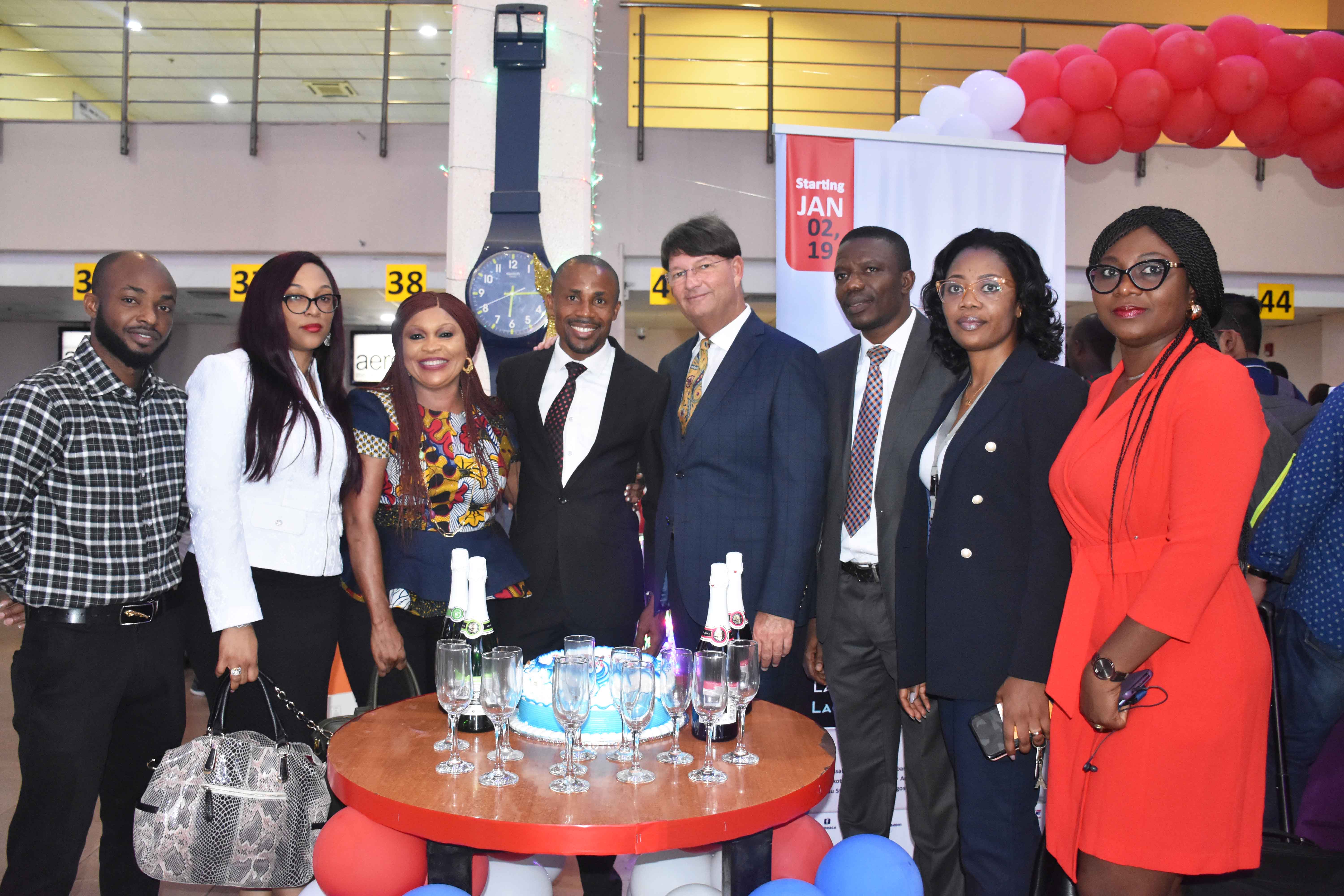Air Peace and Bi-Courtney staff cutting the cake with passengers to flag off the airline’s flight operations at the Murtala Muhammed Airport 2 (MMA2), Lagos on Wednesday